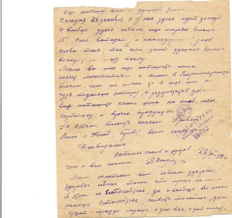 Он очень беспокоился, как живет семья, потом были другие письма. «Мама, писать вам некогда. Сообщаю только, что нахожусь в действующей Армии. Сегодня или завтра буду на фронте. Мама, не плачь и не беспокойся. Все будет в порядке. Посылаю вам свои фотографии, раздайте их родственникам..... Лена и Гоша, напишите своему родному брату. Знаете, как трудно переживать одиночество на чужой стороне ...ваш брат Николай Шулепов. 28.05.1943 год».